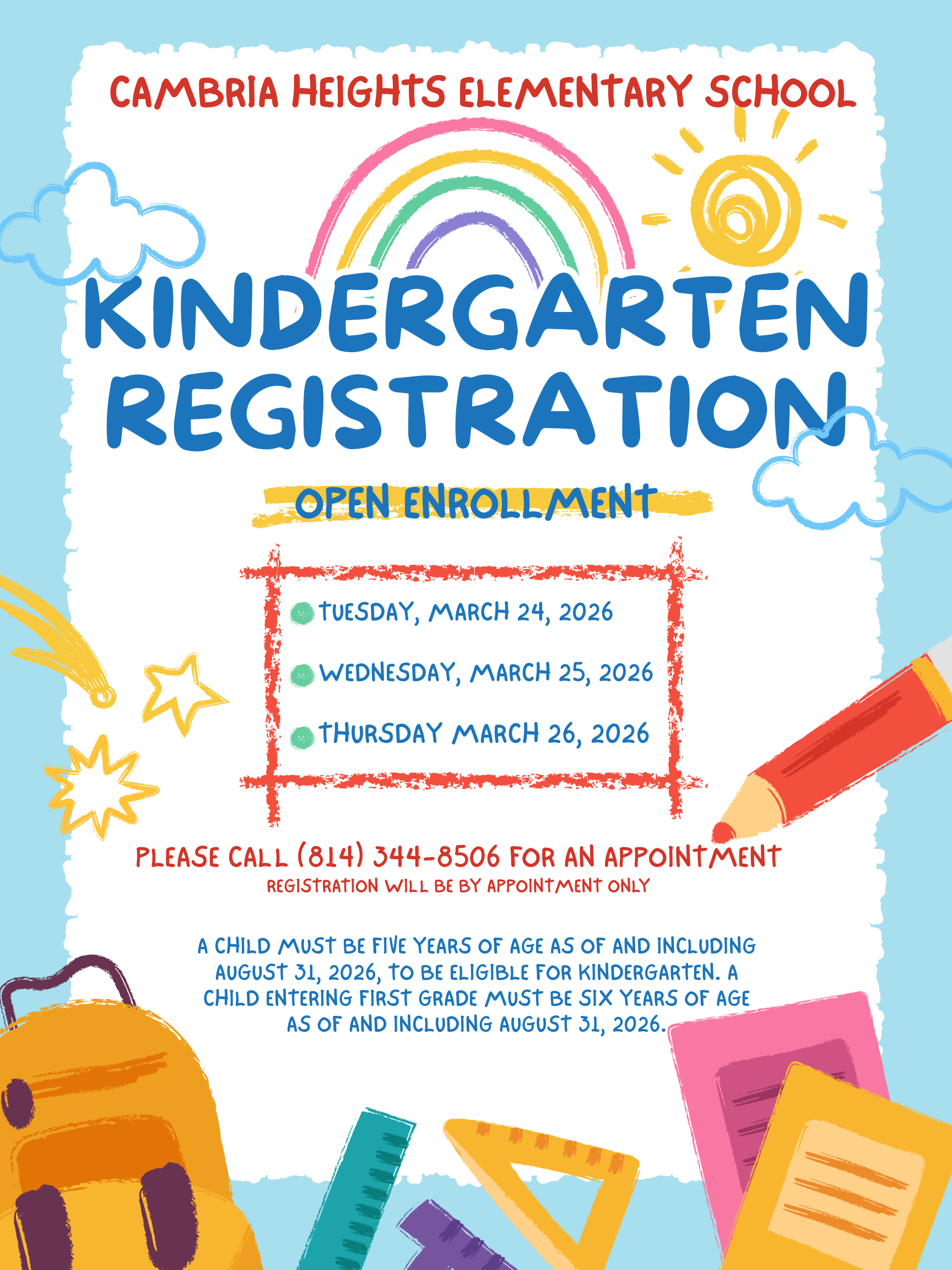 Call (814) 344-8506 to schedule an appointment for Kindergarten Registration for the 2026-2027 school year. Click here for more information.